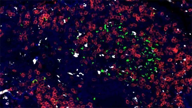 这是一个显微镜图像样本的结核病(TB)来华的人类肺癌、与周围的免疫细胞。
