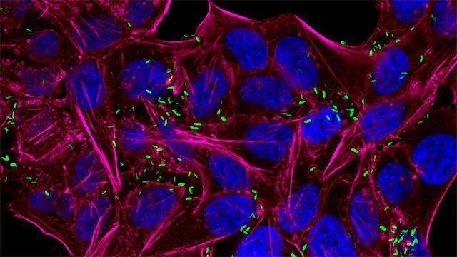 荧光显微镜图像显示空肠弯曲杆菌的细菌感染的人类细胞。